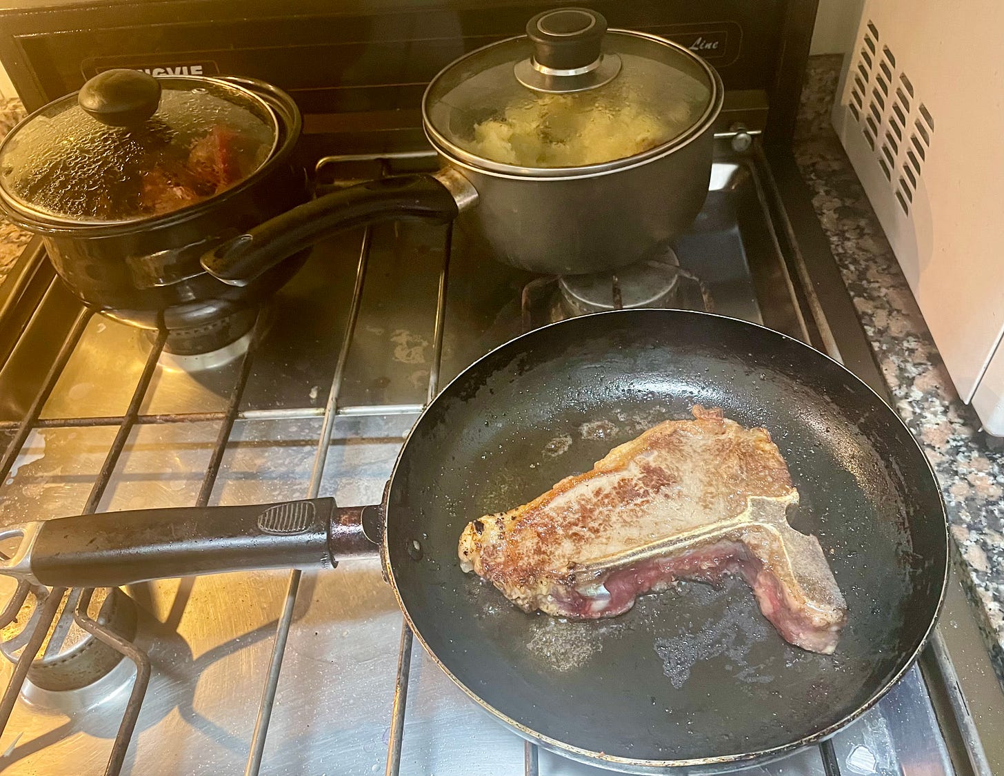 We found a little butcher shop near our place, and bought some nice cuts of meat for dinner the last few evenings. The great pasta options inspired some fettuccine Alfredo made with egg pasta. I also found some gnocchi (potato pasta) at the corner store and made a tomato sauce to go over it. Tom fried up some juicy, delicious steak.